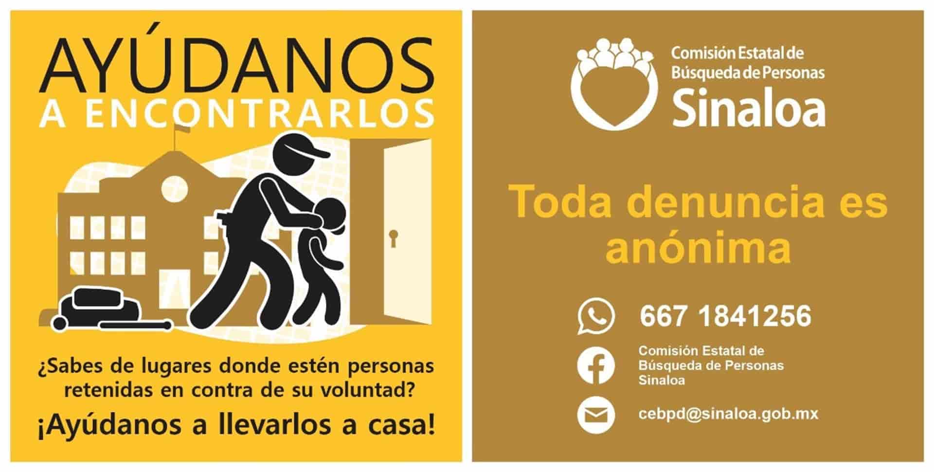 Finalmente recordó que el número para realizar la denuncia anónima es 6671841256 o a través de las redes sociales de la Comisión Estatal de Búsqueda de Personas Sinaloa.