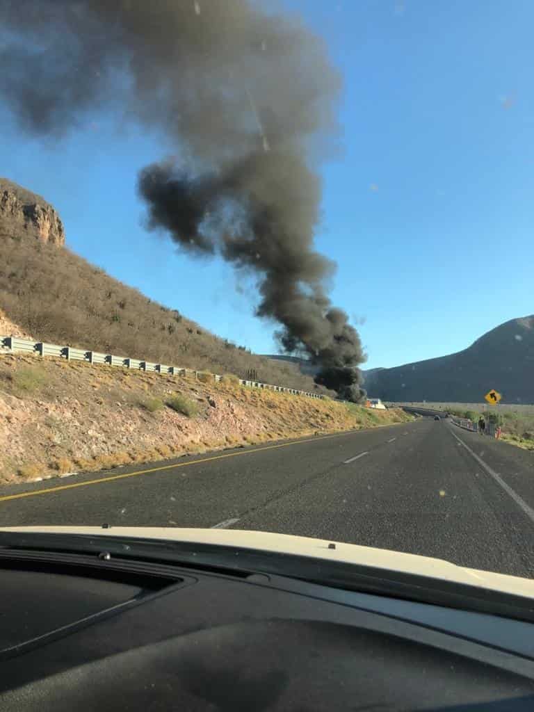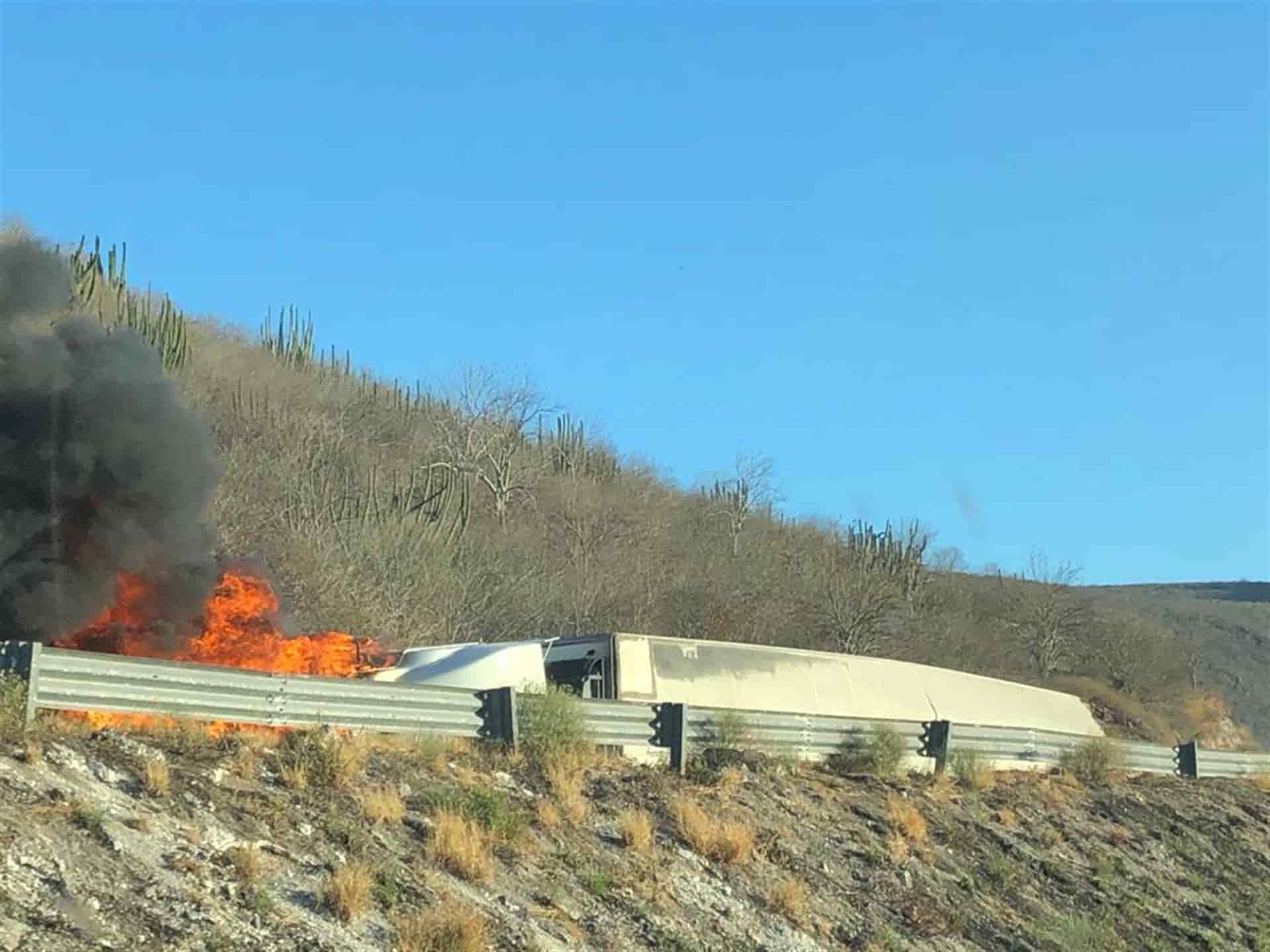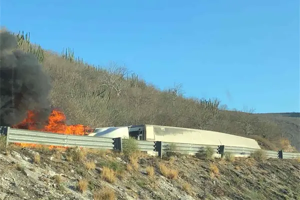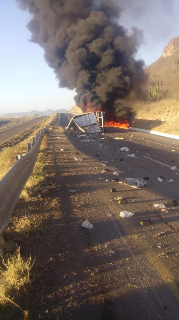 El Carrizo, Sin.- Un tractocamión terminó ardiendo en llamas la tarde de este domingo, luego de chocar sobre la carretera Internacional México 15, en las inmediaciones de los Cerros de Barobampo en el Valle del Carrizo.