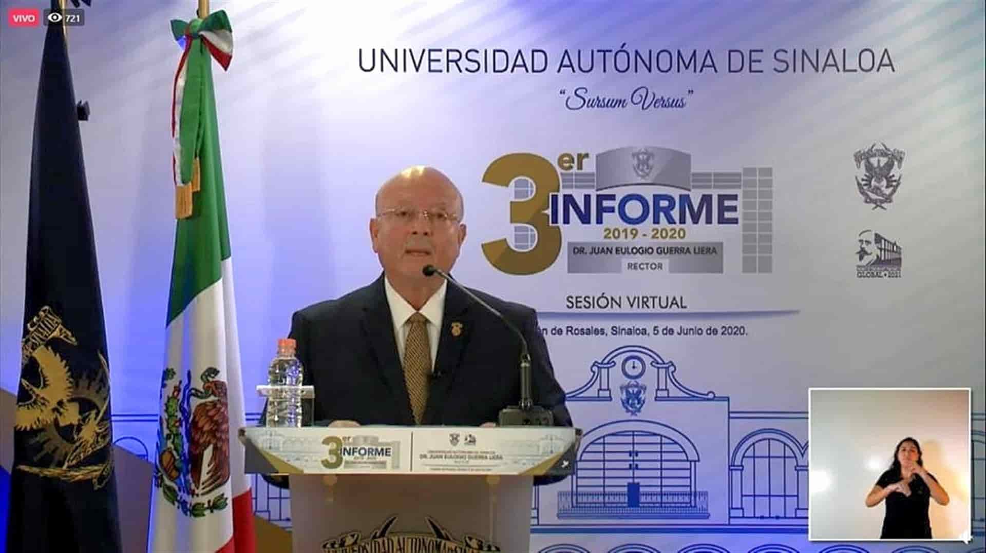 Culiacán, Sin.- El Rector de la Universidad Autónoma de Sinaloa (UAS), Juan Eulogio Guerra Liera, presentó su tercer informe de labores, de su segundo periodo al frente de la institución educativa, en el cual, por primera vez en la historia de la institución, se realizó de manera virtual, ante la pandemia de Covid-19.