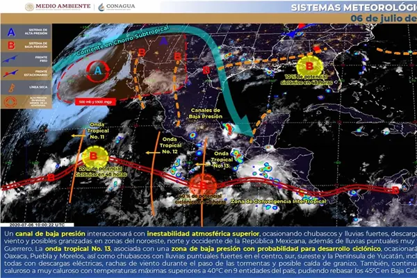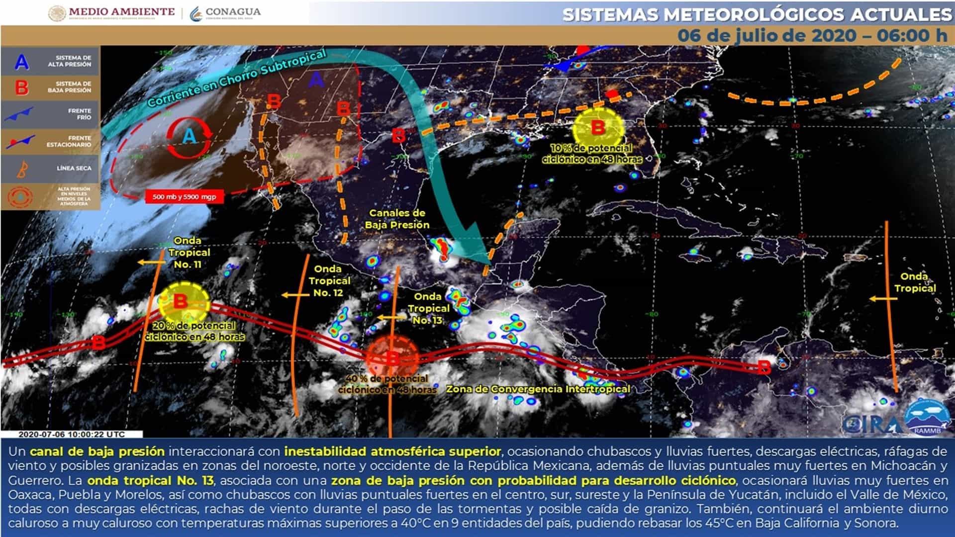 Por otro lado, la onda tropical No. 13, asociada con una zona de baja presión con probabilidad para desarrollo ciclónico frente a las costas de Oaxaca, ocasionará lluvias muy fuertes en Oaxaca, Puebla y Morelos, así como chubascos con lluvias puntuales fuertes en el centro, sur, sureste y la Península de Yucatán, incluido el Valle de México, todas con descargas eléctricas, rachas de viento durante el paso de las tormentas y posible caída de granizo. También, continuará el ambiente diurno caluroso a muy caluroso con temperaturas máximas superiores a 40°C en 9 entidades del país, pudiendo rebasar los 45°C en Baja California y Sonora.