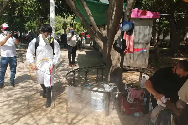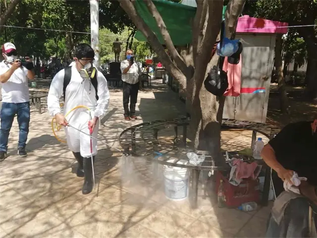 Culiacán, Sin.- Ante el inicio de la reapertura de comercios en el primer cuadro de la ciudad, el Departamento de Mercados y Comercios en la Vía Pública, llevó a cabo una profunda jornada de sanitización de puestos ubicados sobre la plazuela Álvaro Obregón.