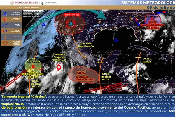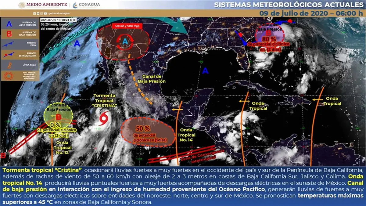 Ciudad de México.- La tormenta tropical “Cristina” ocasionará, en las próximas horas, lluvias muy fuertes en Sinaloa, Colima, Jalisco y fuertes en Baja California Sur, así como rachas de viento entre 50 y 60 kilómetros por hora (km/h) y oleaje de 2 a 3 metros de altura en las costas del Pacífico.