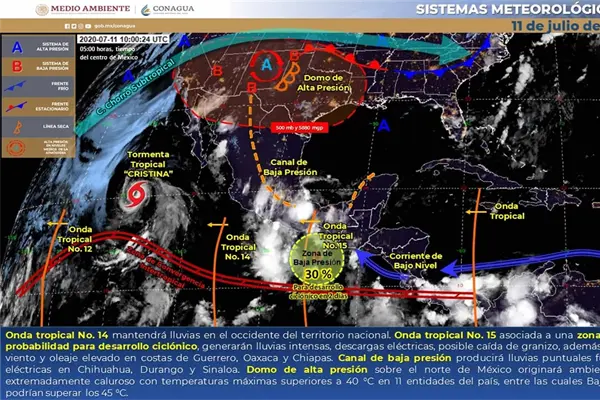 La onda tropical No. 14 se ubicará al suroeste Jalisco y favorecerá lluvias puntuales fuertes a muy fuertes en el occidente del territorio nacional.