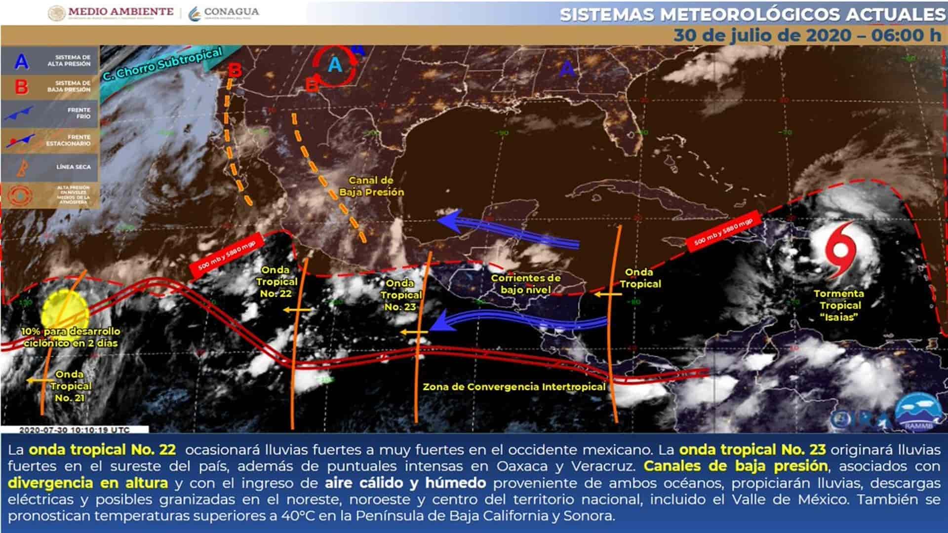 Este día, la onda tropical No. 22 se extenderá al sur de Jalisco y ocasionará lluvias fuertes a muy fuertes en el occidente mexicano. A su vez, la onda tropical No. 23 recorrerá el sureste del país y originará lluvias en dicha región, con puntuales intensas en Oaxaca y Veracruz. Canales de baja presión, asociados con divergencia en altura y con el ingreso de aire cálido y húmedo proveniente de ambos océanos, propiciarán el desarrollo de nublados con lluvias, descargas eléctricas y posibles granizadas en el noreste, noroeste y centro del territorio nacional, incluido el Valle de México. También se pronostican temperaturas superiores a 40°C en la Península de Baja California y Sonora.