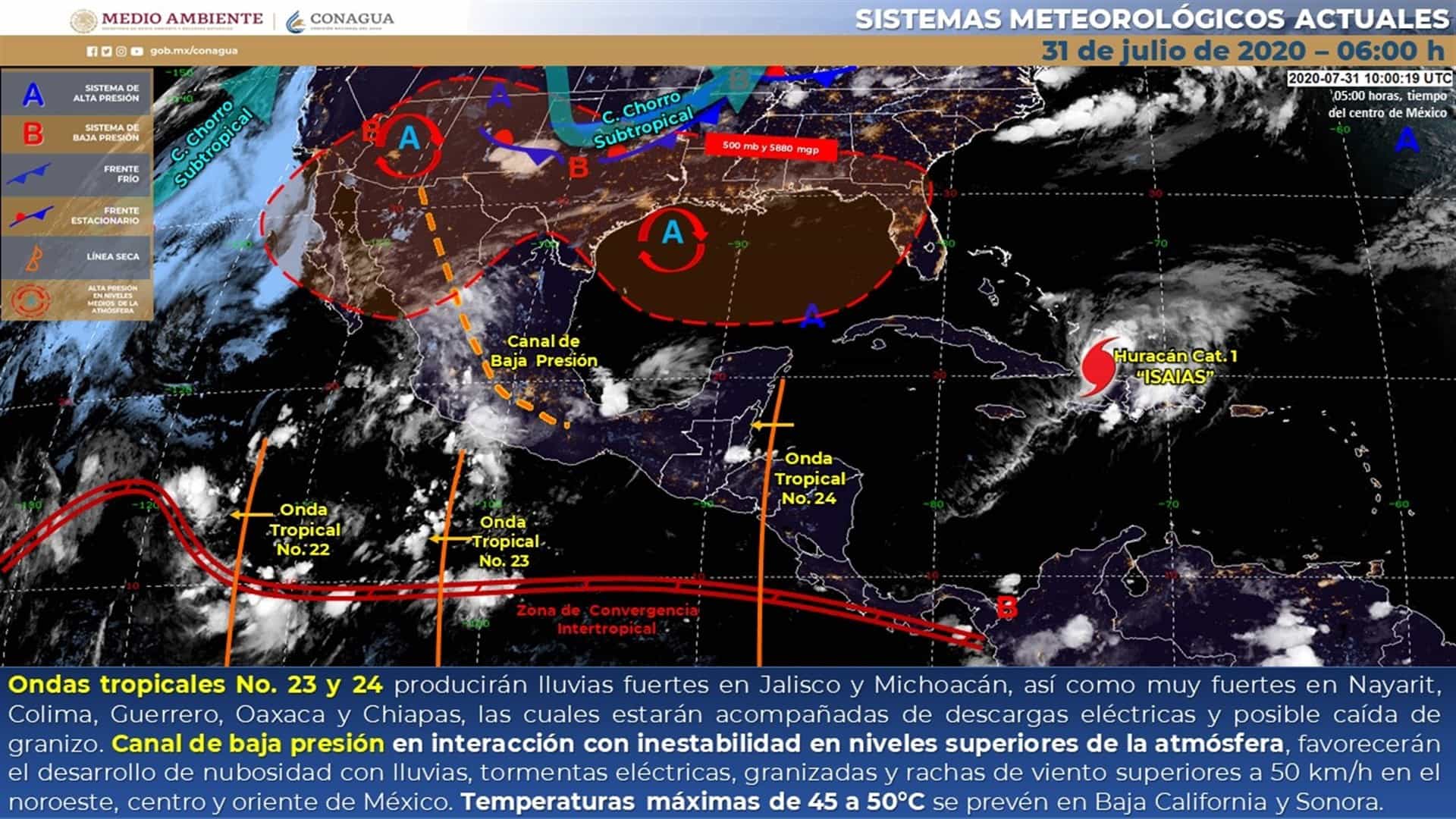 Ciudad de México.- Para hoy, se pronostica que la onda tropical No. 23 recorra el occidente del país, mantendrá el potencial de lluvias fuertes en Colima y Nayarit y muy fuertes en Michoacán y Jalisco, las cuales se acompañarán de descargas eléctricas y posible caída de granizo.