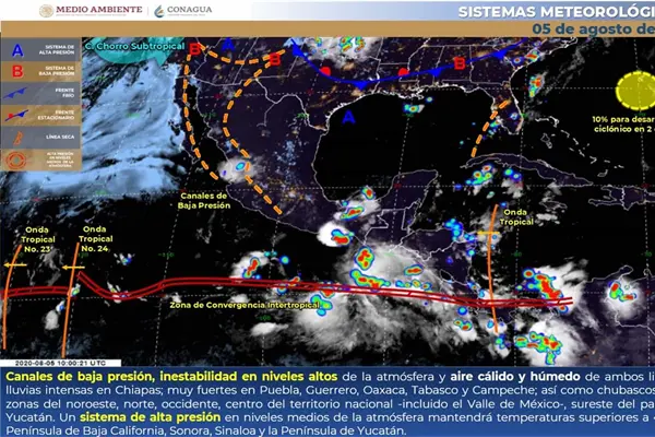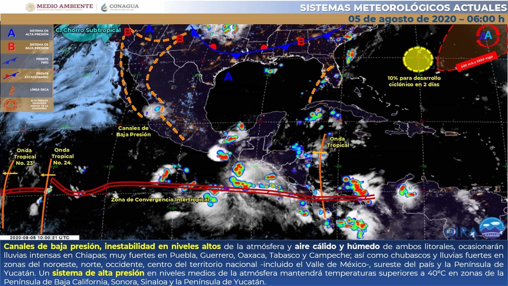Este día un canal de baja presión sobre el interior del país, en interacción con inestabilidad en niveles altos de la atmósfera, ocasionará chubascos y lluvias fuertes, descargas eléctricas, rachas de viento y posibles granizadas en zonas del noroeste, norte, occidente y centro del territorio nacional, incluido el Valle de México, además de lluvias muy fuertes en Puebla, Guerrero y Oaxaca. Un segundo canal de baja presión sobre el sureste de México, asociado con aire cálido y húmedo de ambos litorales, originará lluvias puntuales intensas en Chiapas, muy fuertes en Tabasco y Campeche, además de fuertes en el sureste del país y la Península de Yucatán, todas con descargas eléctricas y rachas de viento. Así mismo, se prevé la aproximación de una nueva onda tropical a las costas de Quintana Roo en horas de la tarde. Finalmente un sistema de alta presión en niveles medios de la atmósfera mantendrá temperaturas superiores a 40°C en zonas de la Península de Baja California, Sonora, Sinaloa y la Península de Yucatán.