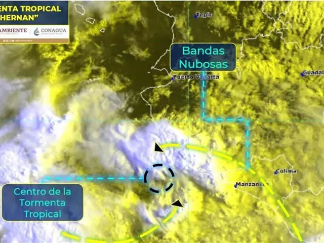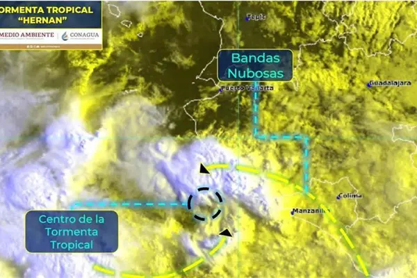 Se proporcionan en el informe la imagen de satélite de las 11:00 horas (tiempo del centro), y se explica que la tormenta tropical “Hernán” en interacción con fuerte entrada de humedad del Océano Pacífico, generará lluvias torrenciales a puntuales extraordinarias en Nayarit, Jalisco, Colima.