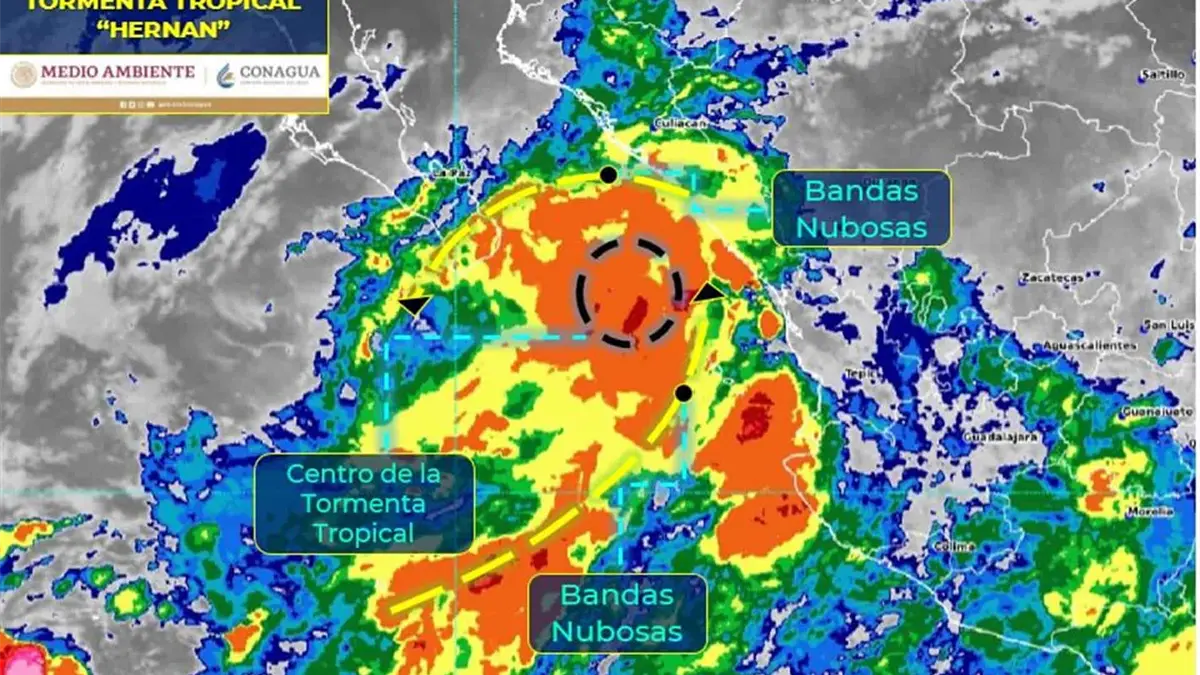 Ciudad de México.- El centro de la Tormenta Tropical “Hernán” se localiza frente a las costas de Sinaloa y se dirige hacia Baja California Sur, sus bandas nubosas ocasionan lluvias torrenciales en Baja California Sur, Sinaloa, Nayarit y Jalisco, además de vientos y oleaje elevado en costas de dichos estados.