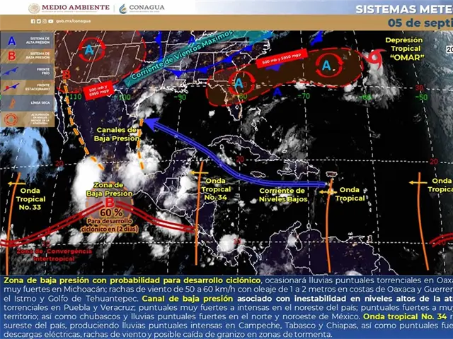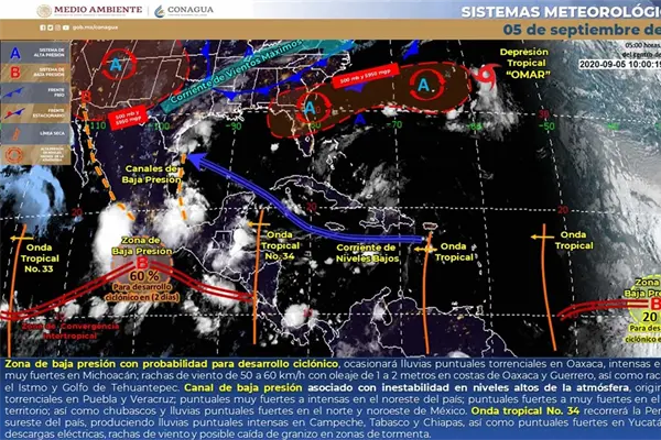 La onda tropical No. 34 recorrerá la Península de Yucatán y el sureste del país, produciendo lluvias puntuales intensas en Campeche, Tabasco y Chiapas, así como puntuales fuertes en Yucatán y Quintana Roo. Las lluvias estarán acompañadas de descargas eléctricas, rachas de viento y posible caída de granizo en zonas de tormenta.