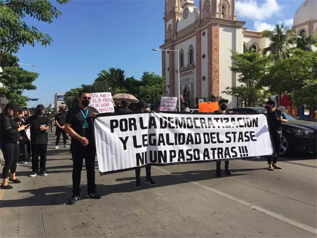 Culiacán, Sin.- Un grupo de 30 trabajadores del Stase se manifestó este jueves a un costado de la Catedral para exigir que se revoque el proceso, en el cual resultó ganadora Teresita Ochoa Pérez.