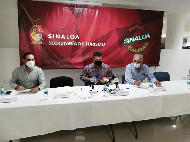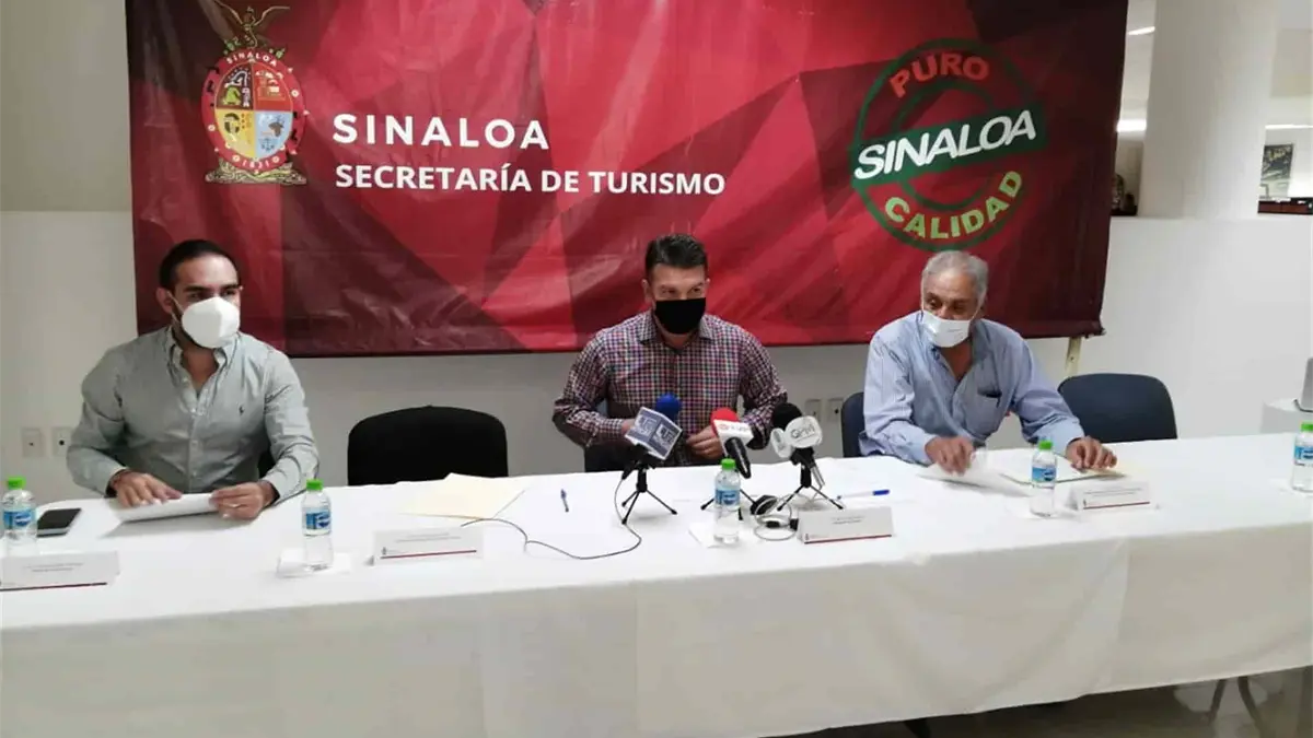 En rueda de prensa el Secretario de Turismo estuvo acompañado por directores de área de la Sectur estatal y Luis Terán Tirado, Secretario de Desarrollo Económico, Turismo y Pesca de Mazatlán.