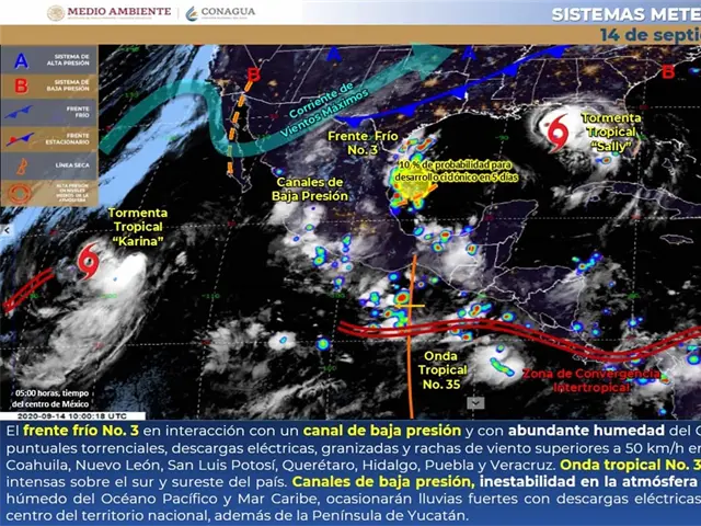 Este día, el frente frío No. 3 recorrerá lentamente el norte y noreste del país, interaccionará con un canal de baja presión en el occidente del Golfo de México y con abundante humedad del Golfo de México, condiciones que originarán lluvias puntuales torrenciales, descargas eléctricas, granizadas y rachas de viento superiores a 50 km/h en Tamaulipas; lluvias intensas en Coahuila, Nuevo León, San Luis Potosí, así como en la porción norte de Querétaro, Hidalgo, Puebla y Veracruz. La onda tropical No. 35 se extenderá sobre el sur y sureste del país, en donde mantendrá probabilidad de lluvias muy fuertes a intensas. Canales de baja presión asociados con inestabilidad en la atmósfera superior y con la entrada de aire cálido y húmedo proveniente del Océano Pacífico y Mar Caribe, ocasionarán lluvias fuertes con descargas eléctricas sobre el noroeste, occidente y centro del país, además de la Península de Yucatán.