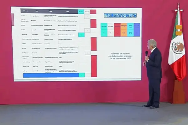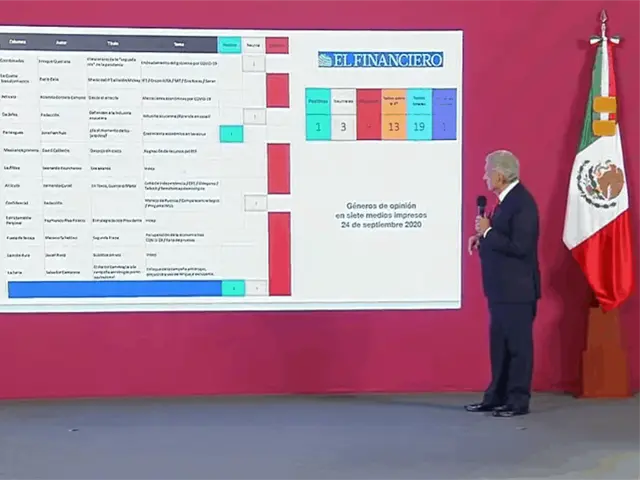 En su conferencia de prensa desde Palacio Nacional, López Obrador mostró un análisis de las columnas publicadas el jueves por los siete principales periódicos del país, según el cual el 10,6 % de los textos fueron positivos con el Gobierno, el 23,1 % neutrales y el 66,3 % negativos.