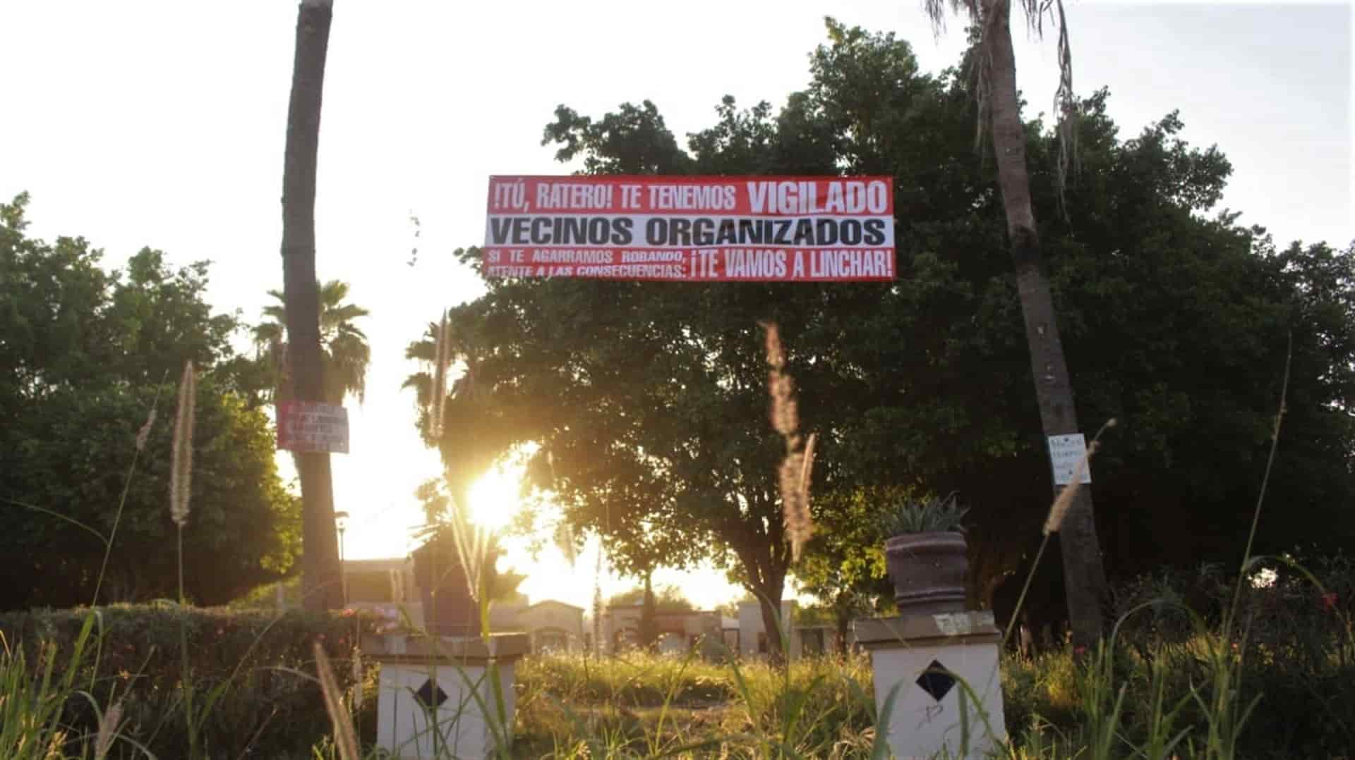 Los Mochis, Sin.- Tras una serie de robos en sus domicilios y situaciones de inseguridad, vecinos del fraccionamiento , al sur-poniente de esta ciudad, se hartaron y colocaron mantas donde advierten a los ladrones de un posible linchamiento, si los atrapan.