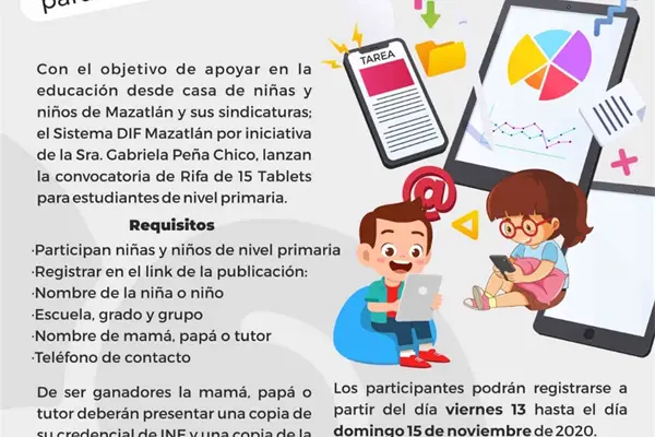 Mazatlán, Sin.- Para promover y apoyar la educación de los niños y niñas de Mazatlán, ys que en estos que momentos resultan difíciles para los padres de familia la compra de equipos electrónicos y digitales, el Sistema DIF municipal convoca a una rifa de 15 tablets.