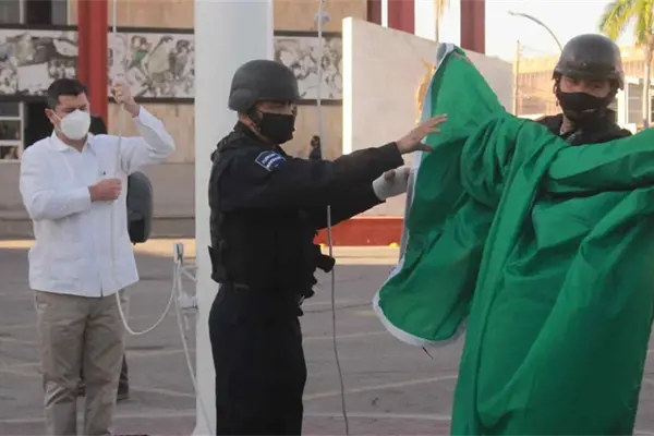 Los Mochis, Sin.- Aunque el tradicional desfile por el 110 aniversario de la Revolución Mexicana se canceló por la pandemia de Covid-19, autoridades municipales, civiles, deportivas y militares de Ahome llevaron a cabo un acto de conmemoración, en la explanada de Palacio Municipal.