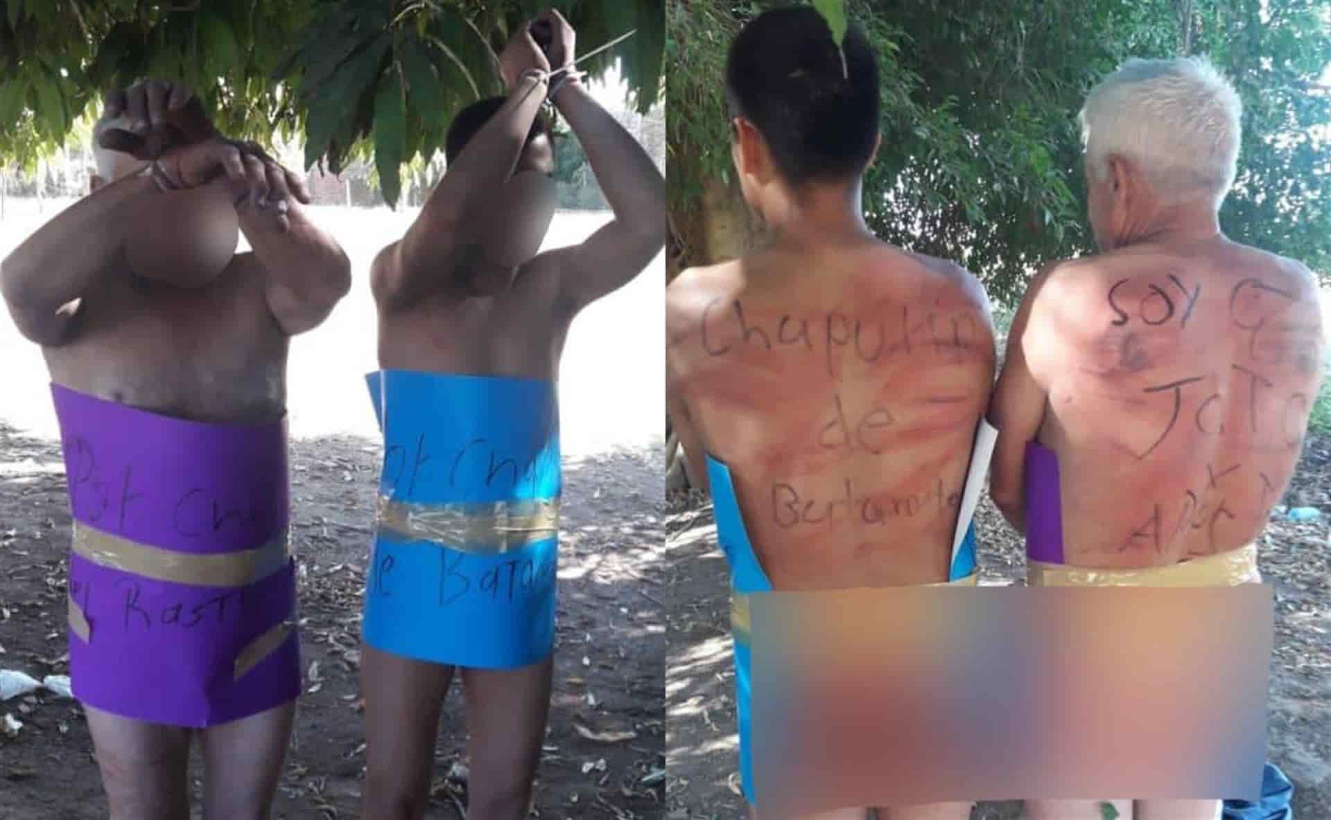 Los dos hombres traen pegadas al cuerpo cartulinas con cinta canela, y además, letras en la espalda, en una de las leyendas de lee: “chapulín de Batamote”, en el otro no se logra aprecia el mensaje. También se les miran golpes en los glúteos y espalda.