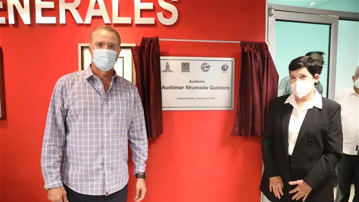 El mandatario estatal acompañó a la viuda de Audómar Ahumada, a la señora Blanca Célida Valenzuela de Ahumada, a su hijo Omar Ahumada, y demás familiares, en esta sentida ceremonia que tuvo lugar en el Centro de Capacitación para el Desarrollo Empresarial y Tecnológico (CECADET) del ICATSIN en Ciudad Educadora y Sustentable del Saber, que fue fundado por el propio homenajeado y en reconocimiento a ello, se develó la placa del auditorio con su nombre.
