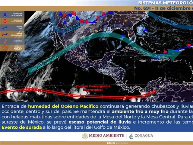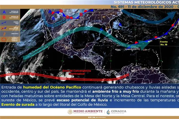 Por otra parte, se pronostica evento de surada (viento de componente sur) a lo largo del litoral del Golfo de México. Finalmente, un nuevo frente frío se aproximará a la frontera norte de México.
