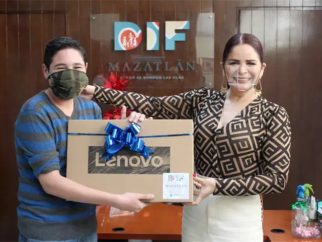 La Presidenta de DIF Mazatlán, Gabriela Peña Chico, hizo entrega personalmente de la laptop al joven ganador Alexander Mondragón Rubí, y a los 3 ganadores de tablets; Omar Osuna, Esmeralda Michel y Jesús Manuel Juárez.