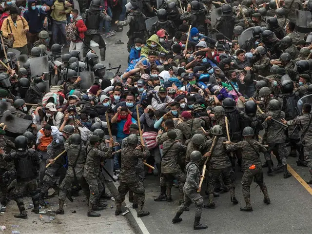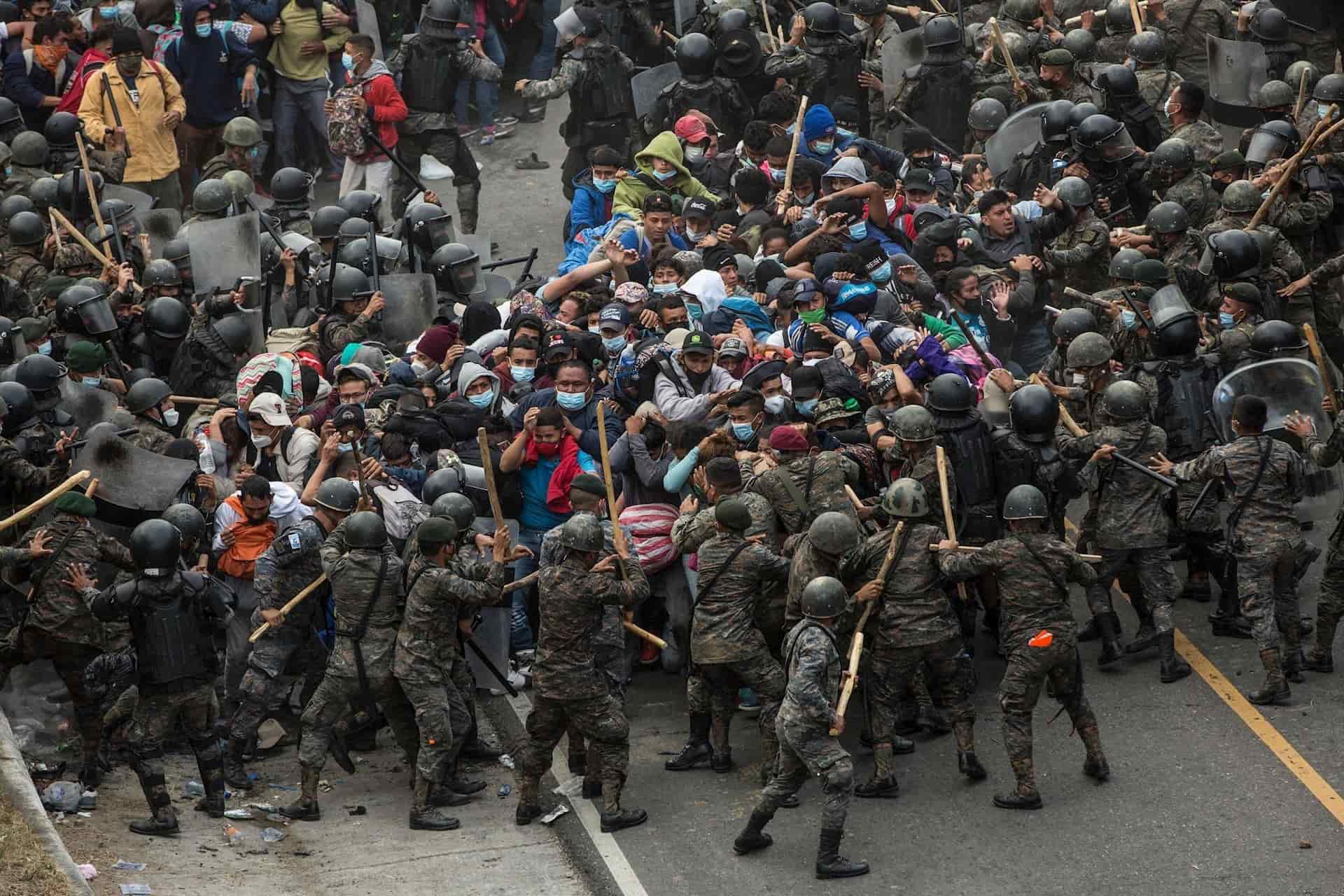 Al filo de las 07.00 hora local (13.00 GMT), los miles de hondureños intentaron romper la barrera policíaca, pero fueron reprimidos violentamente por aproximadamente un minuto por el Ejército de Guatemala y la Policía Nacional Civil, obligándolos a retroceder.