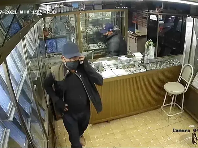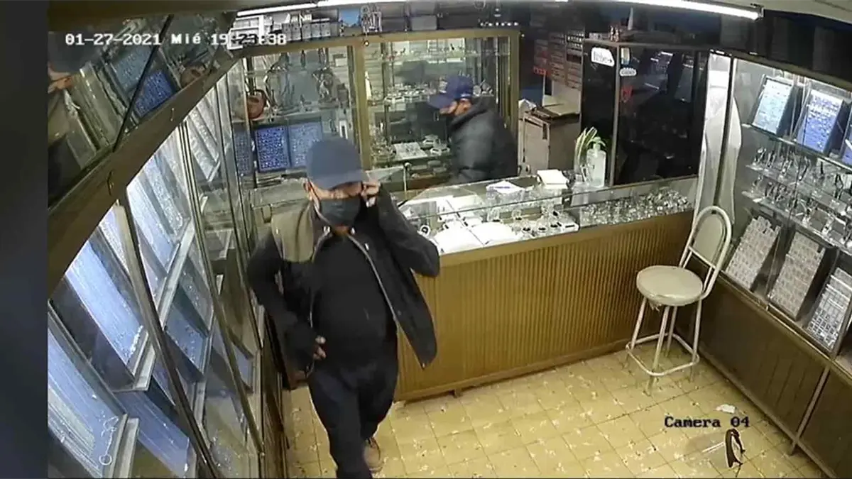 El robo fue videograbado por cámaras de seguridad del circuito cerrado de la misma joyería, donde se observa a los dos sujetos que ingresan al negocio. Allí, el hombre mayor se acerca a la empleada, mientras se saca una arma que lleva fajada al frente, con la que la amenaza y se la lleva a la parte trasera en donde la amarró.