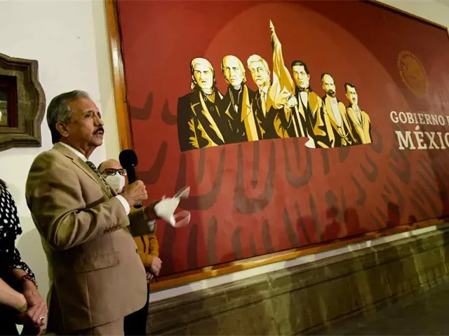 El Presidente Andrés Manuel López Obrador aparece junto a José María Morelos, Miguel Hidalgo, Benito Juárez, Francisco I. Madero y Lázaro Cárdenas