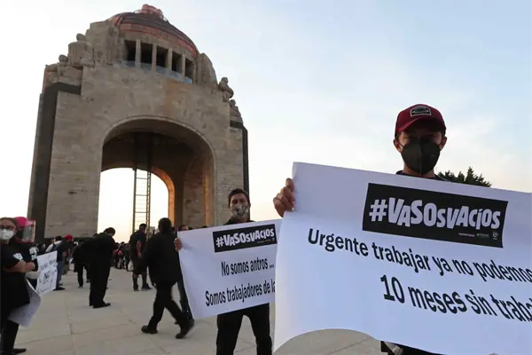 Para llamar la atención de las autoridades, unos 300 trabajadores del sector, meseros, garroteros (vigilantes), cajeros, "bartenders", "DJ's" y cajeros, entre otros, todos vestidos de negro, se manifestaron de manera pacífica en el centro de la Ciudad de México con careta, cubrebocas y sana distancia.