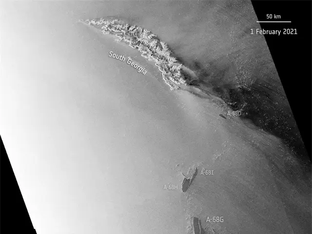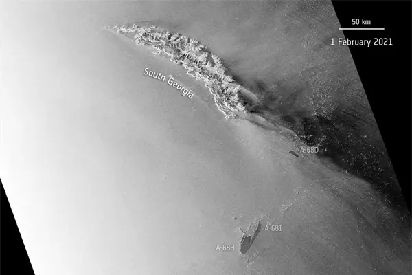 Las imágenes revelaron que el iceberg había sufrido grietas de gran tamaño la semana pasada y desde entonces se ha roto en múltiples trozos, lo que "podrían indicar el fin de la amenaza medioambiental del A-68A para Georgia del Sur", señala la ESA.