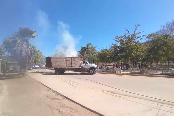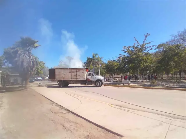 Se informó que el chofer maniobró, pero por causas desconocidas, chocó contra el poste de la CFE y este se vino abajo, lo que provocó que el cableado cayera sobre el cofre del camión, al mismo tiempo que causó un chispazo, con lo que se incendió la basura que traía la unidad en la caja.