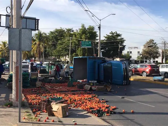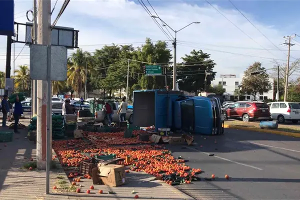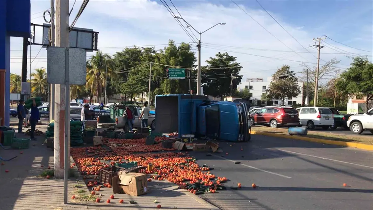 Culiacán, Sin.- La avenida De Las Américas, en su cruce con la calle Josefa Ortiz de Domínguez, en el sector de Ciudad Universitaria, en Culiacán, terminó cubierta de tomate y pepino, luego que un camión doble rodado que transportaba verduras se volcara en el lugar tras participar en un choque contra una camioneta Cheyenne.