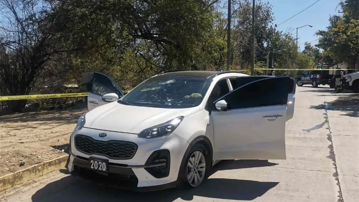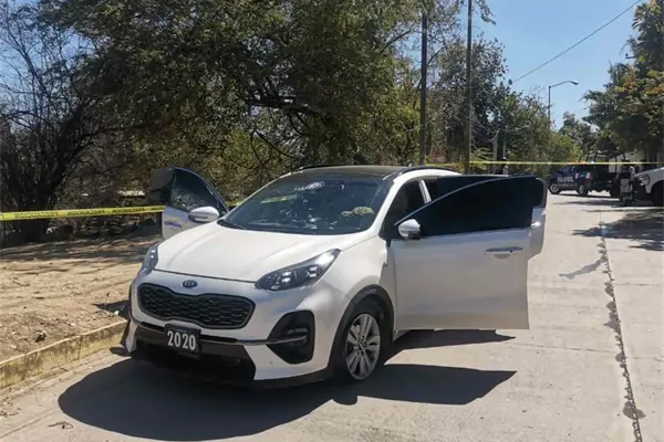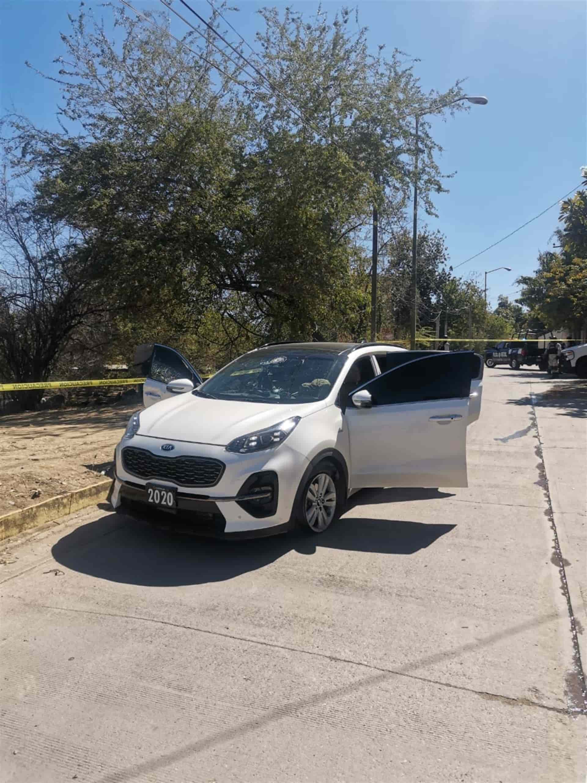 Se trata de un vehículo marca Kia blanco de modelo reciente el cual quedó con impactos de arma de fuego, además una persona sin vida en el interior, así como dos armas de uso exclusivo del Ejército.