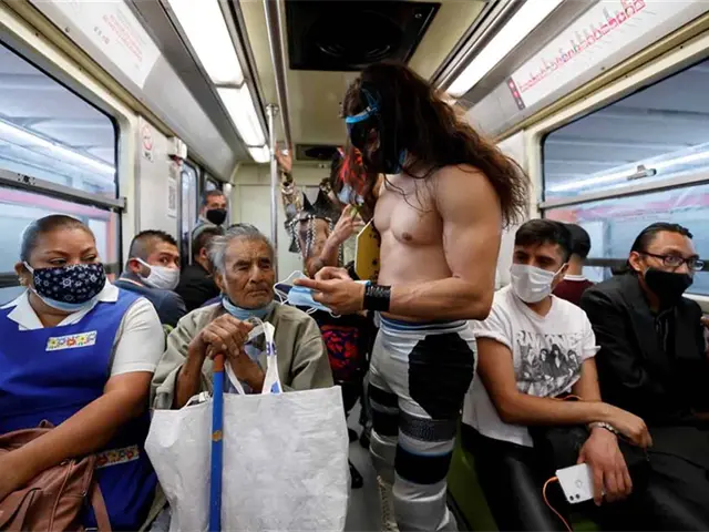 "Estamos haciendo conciencia a toda esta gente que todavía dice que no existe el coronavirus. Venimos con cubrebocas, sanitizante y todas las medidas de seguridad que deben de haber en el metro para cuidarnos", dijo a Efe el Bandido, vestido con un traje de lentejuelas doradas con su férreo abdomen a la vista.