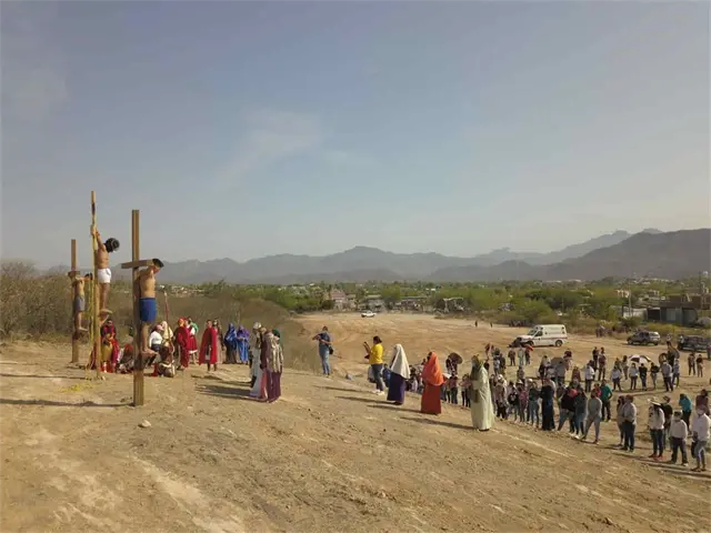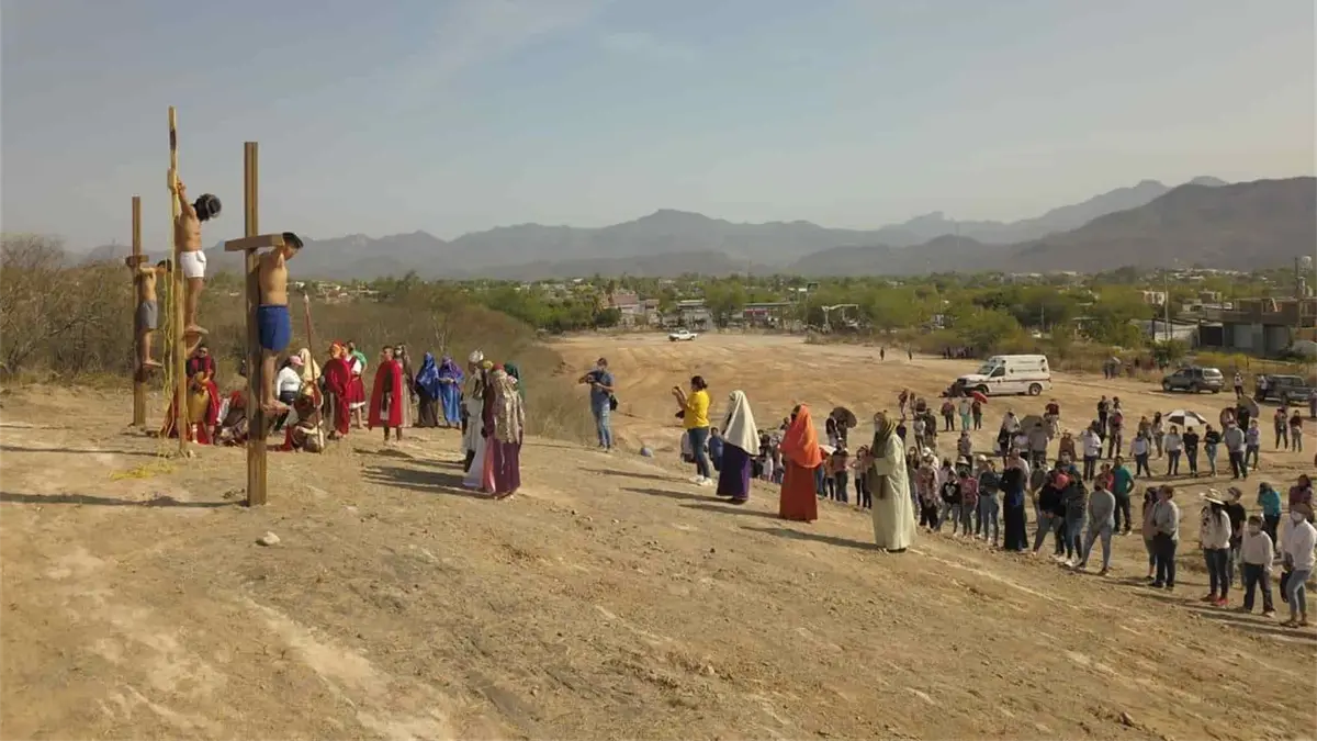 El "camino de la cruz" - significado de viacrucis- contó con el apoyo de Protección Civil y Seguridad Pública para garantizar las medidas preventivas anticovid entre las personas encargadas de participar en la pasión y muerte de Jesucristo este Viernes Santo.