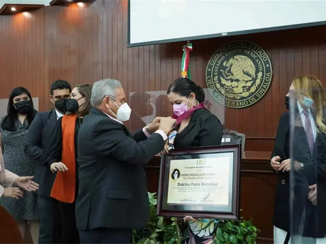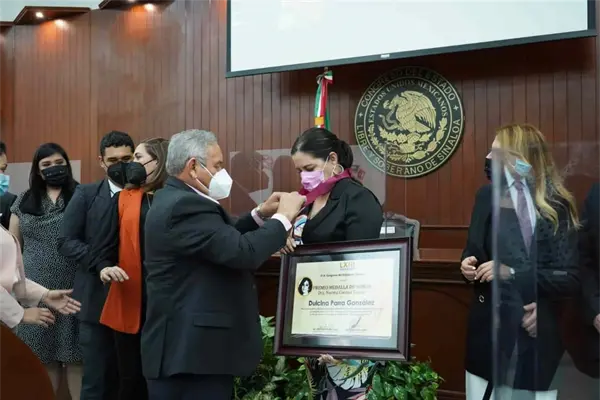 Culiacán, Sin.- En sesión solemne en el Congreso de Sinaloa, la 63 Legislatura le entregó el premio Medalla de Honor "Norma Corona Sapién" a la periodista y activista, Dulcina Parra González.