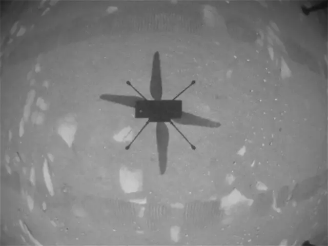 Junto con el mensaje, y como ocurrió con el primer vuelo realizado el lunes, la NASA publicó una fotografía en blanco y negro de la sombra del Ingenuity sobre suelo marciano registrada por una de sus cámaras.