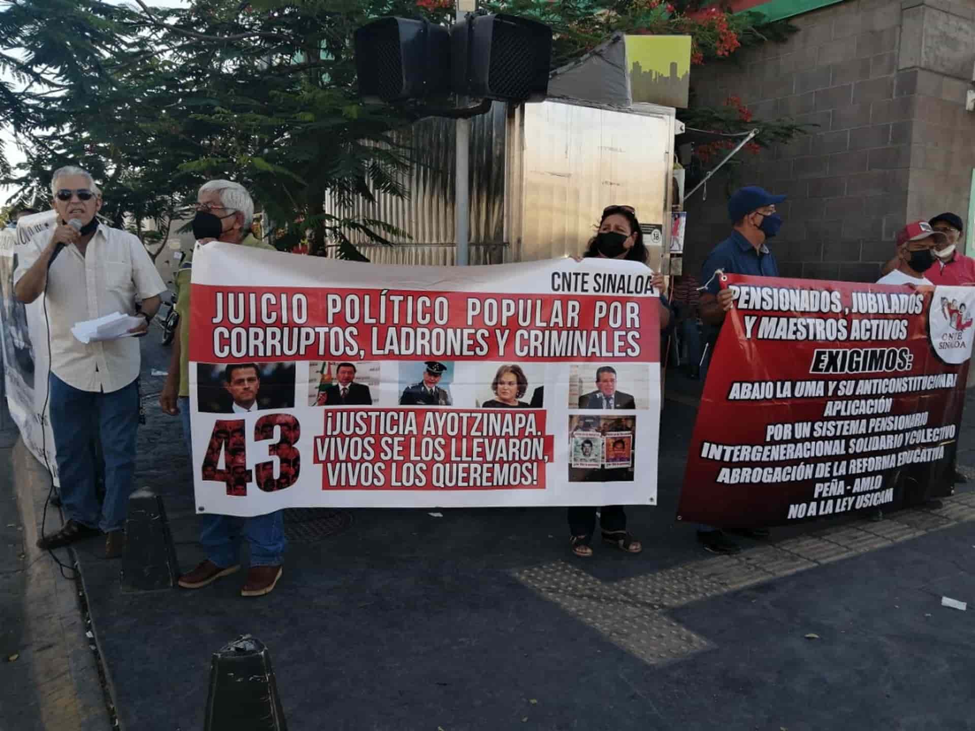 Los Mochis, Sin.- Profesores activos y jubilados pertenecientes a la Coordinadora Nacional de los Trabajadores de la Educación de la zona norte se manifestaron de manera pacífica, en exigencia de incremento salarial, abrogación de la Reforma Educativa, la UMA y que se asignen recursos para el regreso a clases presencial.