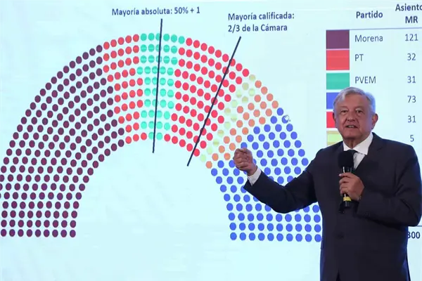 El mandatario proyectó un gráfico elaborado con los datos preliminares del Instituto Nacional Electoral (INE), según el cual la coalición oficialista liderada por el Movimiento Regeneración Nacional (Morena) obtuvo el domingo 280 de los 500 diputados de la Cámara Baja.