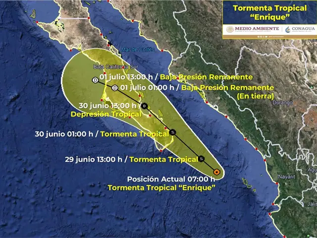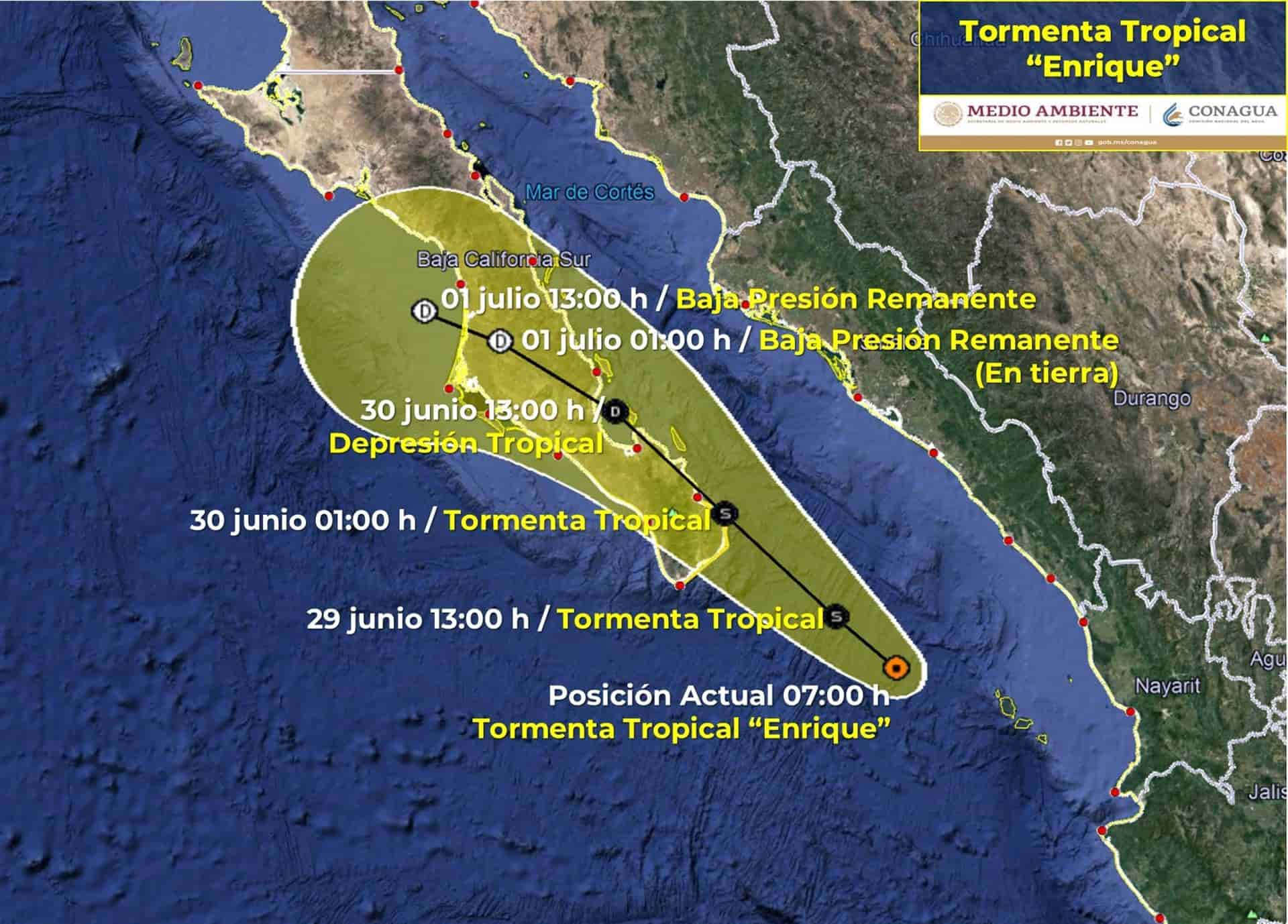 Ciudad de México.- La Tormenta Tropical "Enrique" continúa debilitándose mientras se desplaza hacia Baja California Sur, sus bandas nubosas ocasionan lluvias fuertes a puntuales intensas sobre estados del occidente y noroeste del país; en el caso de Sinaloa, se prevén lluvias puntuales intensas de 75 a 150 mm, de acuerdo con el Servicio Meteorológico Nacional.