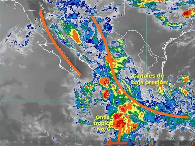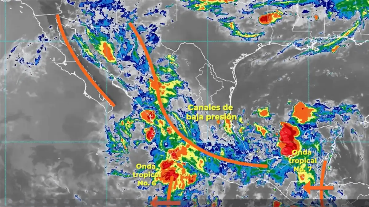 Para hoy, la onda tropical Núm. 7 se desplazará sobre el sureste del país, interaccionará con un canal de baja presión extendido sobre el oriente de México y con inestabilidad atmosférica superior, ocasionando lluvias fuertes a muy fuertes las cuales se acompañarán de descargas eléctricas y posibles granizadas sobre los estados del oriente y sureste del territorio nacional. Por otra parte, la onda tropical Núm. 6 se ubicará frente a las costas del occidente de México, en combinación con un canal de baja presión el cual se extenderá desde el noroeste hasta el centro del país y con la entrada de humedad proveniente del Océano Pacífico, originarán lluvias fuertes a muy fuertes con descargas eléctricas y posible caída de granizo en el noroeste, norte, occidente, centro y sur del país, incluido el Valle de México, llegando a registrarse lluvias puntuales intensas en Jalisco, Colima, Michoacán y Guerrero.