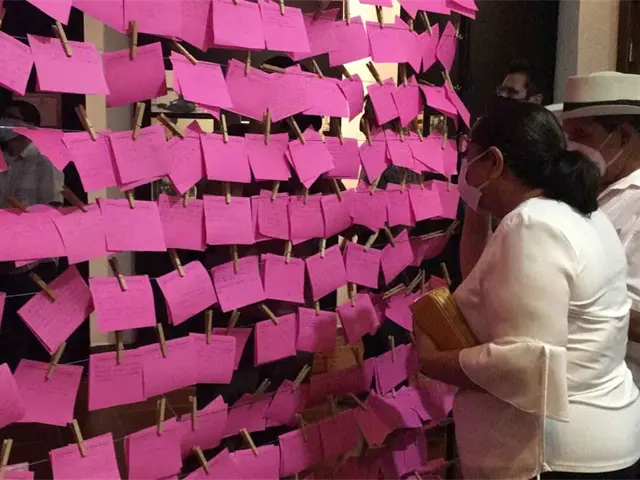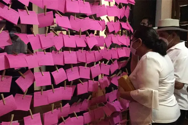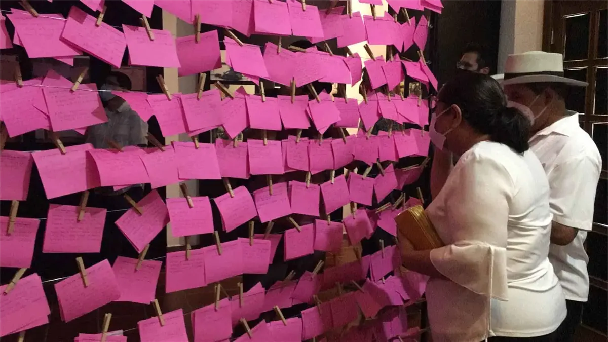 Y en unas pequeñas papeletas color rosa, mismas que colocó en un tendedero de 3 x 2 metros, la mayoría de las respuestas fueron en torno al acoso sexual en el espacio y transportes públicos.