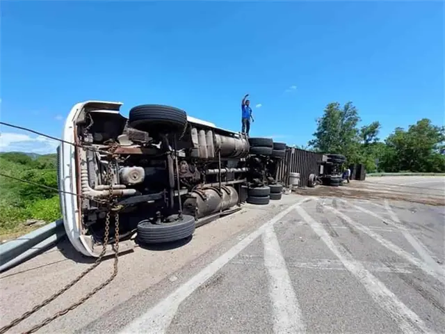 Mazatlán, Sin.- Pérdidas materiales se registraron en la autospista Mazatlán-Culiacán tras el volcamiento de un tráiler, a la altura de El Venadillo.