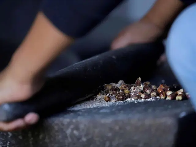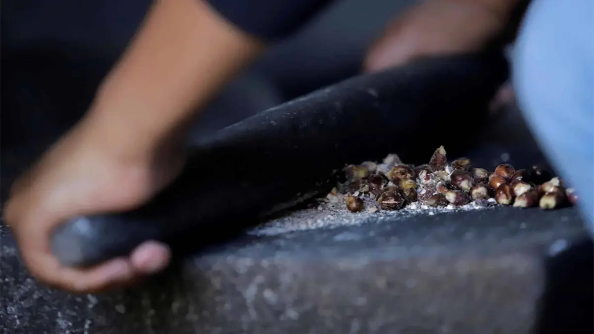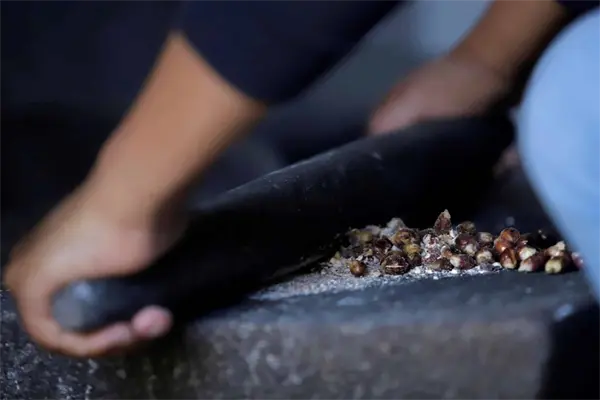 Posteriormente, se tritura o se hace harina en un metate, que es un utensilio de cocina prehispánico que utilizaban las culturas mesoamericanas.