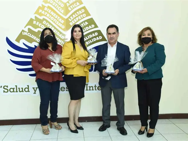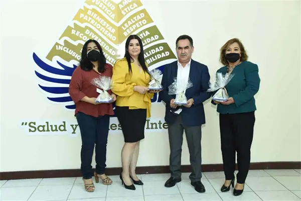 El Rector de la UAS, Jesús Madueña Molina, recibió de la directora de la Unidad de Bienestar Universitario (UBU), Sofía Angulo de Madueña, una réplica de la pirámide de valores en el lobby de Rectoría, donde se instaló la figura a la vista de los usuarios del edificio.
