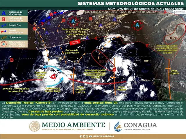 Este jueves, la circulación de la depresión tropica Catorce-E tendrá interacción con la onda tropical número 24; ambos fenómenos dejarán lluvias de 75.1 a 150 milímetros en Michoacán, Guerrero, Oaxaca y Chiapas; y de 50.1 a 75 milímetros en Nayarit, Jalisco y Colima.