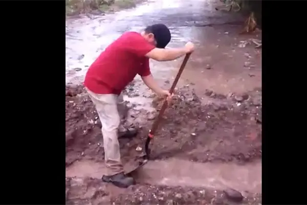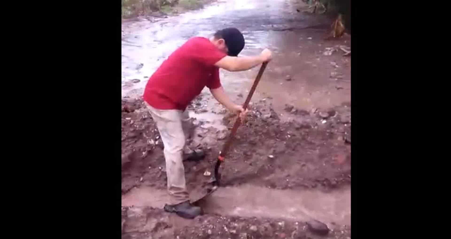 Con una pala hacen zanja para no inundarse en el Águila Azteca