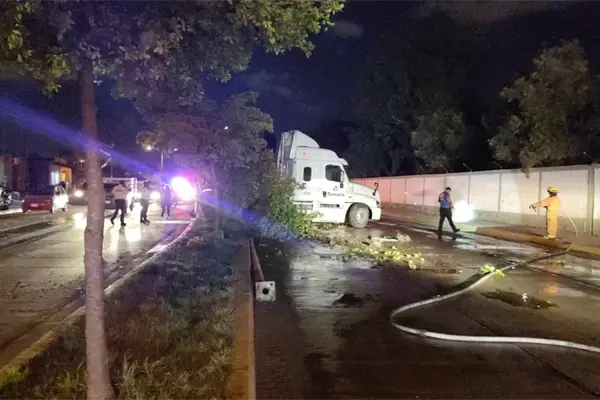 El accidente se registró cuando el conductor del tráiler circulaba de sur a norte sobre la avenida Juan Pablo Segundo y perdió el control e impactó contra un árbol, y una luminaria del camellon central a la altura de la III Región Militar y Octavo Batallón de Infantería.