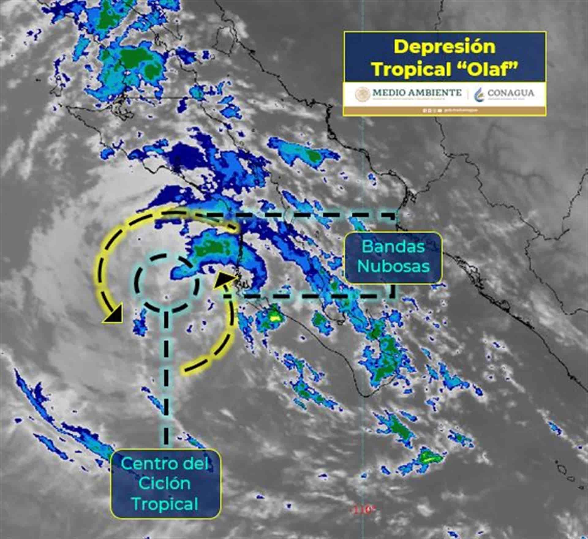 El fenómeno meteorológico "Olaf", ahora como depresión tropical, se localiza 100 km al oeste de Cabo San Lázaro, Baja California Sur.