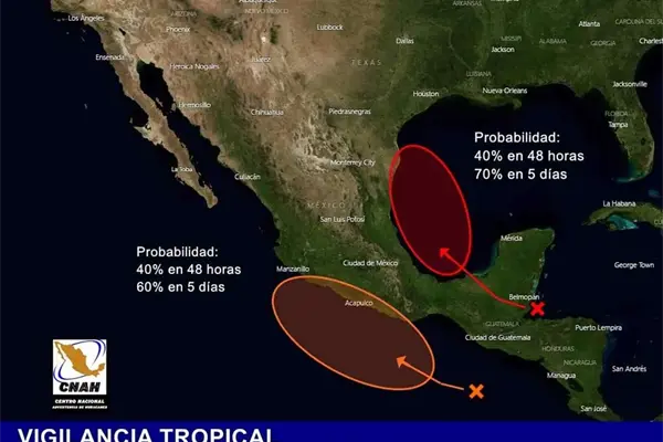 La primera es una zona de baja presión con potencial ciclónico y se localiza a cientos de kilómetros al sur de Guatemala y México, e impulsa lluvias y tormentas dispersas debido al desplazamiento de una onda tropical.