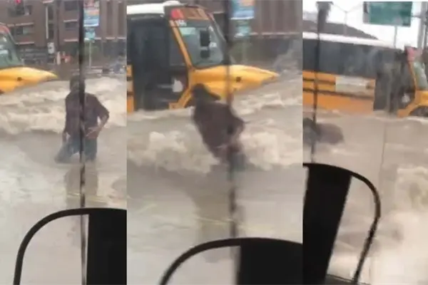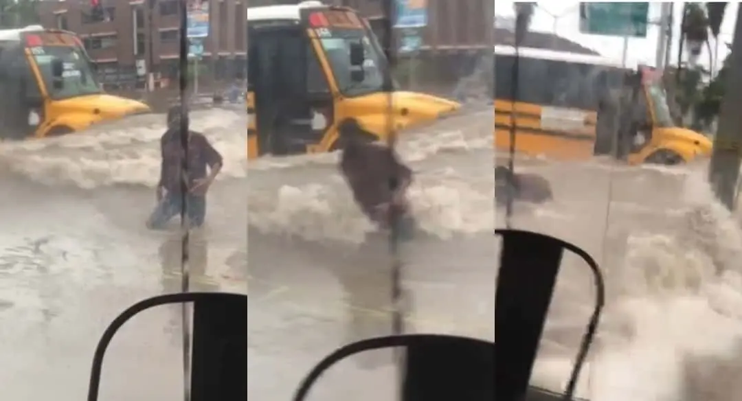Los videos se hicieron virales, mientras un hombre que intentó cruzar la avenida Independencia y casi llegaba a la banqueta de conocida pizzería de la esquina con Antonio Rosales, pero las olas lo tumbaron y terminó bañado.